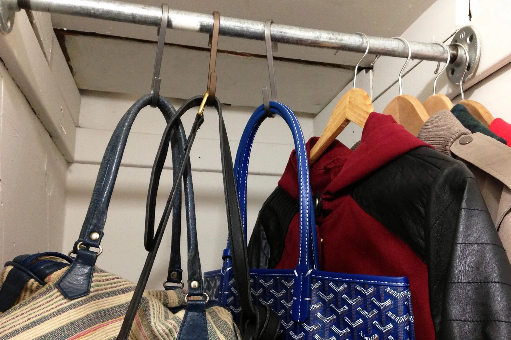 No matter how you hang them, do a purse purge first to avoid creating a handbag jungle. Keep that oversized bag you only pull out for special occasions tucked out of the way.